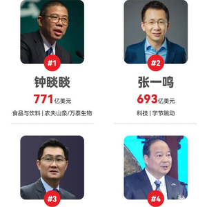 该榜单显示,字节跳动联合创始人张一鸣身家增长237亿美元,以693亿美元的财富值跃升至第二位。腾讯董事会主席马化腾的财富增长超三分之一,达到628亿美元,但排名滑落至第三位。