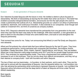 近日,担任红杉资本掌门人仅三年多的Roelof Botha(罗洛夫·博塔)宣布辞去全球领导人(Senior Steward)职务,由Alfred Lin(林君叡)及Pat Grady(帕特·格雷迪)接任,并联合管理红杉资本。
