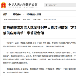商务部新闻发言人就美针对无人机领域增列“不可信供应商清单”事答记者问