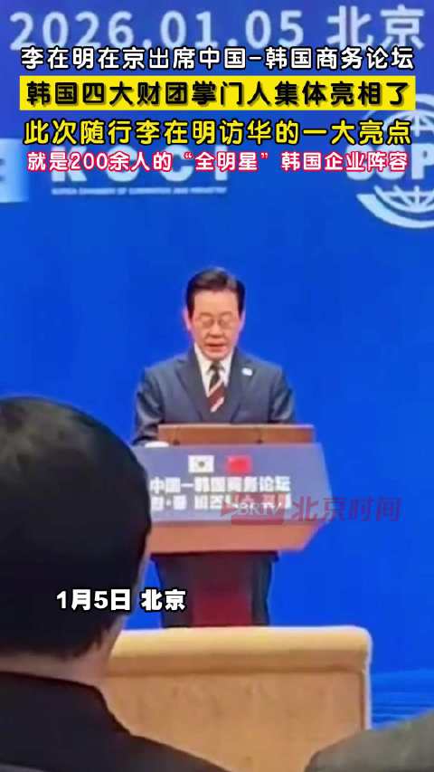 1月5日,韩国总统李在明出席中韩商务论坛,三星电子会长李在镕、SK集团会长崔泰源、现代汽车集团会长郑义宣、LG集团会长具光谟“四大财团”掌门人集体亮相。据悉,此次随行访华的一大亮点,就是200余人的“全明星”企业阵容。