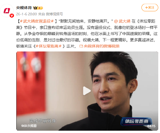 [武大靖官宣退役 ]“默默无闻地来,安静地离开。” @武大靖 在《体坛零距离》节目中,亲口宣布结束运动员生涯。没有退役仪式,就像他初登冰场时一样平静。从争金夺银的巅峰到转身退场的时刻,他在冰面上书写了中国速度的荣耀。这份低调的告别,是对过往最好的珍藏。祝福大靖,下一程更精彩。更多真诚讲述,敬请关注《#体坛零距离# 》正片。