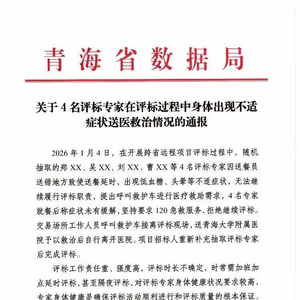 近日,青海省数据局在青海省公共资源交易网发布《关于4名评标专家在评标过程中身体出现不适症状送医救治情况的通报》。