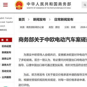 1月12日,据商务部官网消息,为落实中欧领导人会晤共识,妥善解决欧盟对华电动汽车案,中欧双方本着相互尊重的态度,进行了多轮磋商。双方一致认为,有必要向对欧盟出口纯电动汽车的中国出口商,提供关于价格承诺的通用指导,以便中国出口商可通过更加实用、有针对性且符合世贸组织规则的方式,解决相关关注。