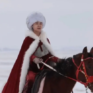 当时昭苏已经下雪了,天马旅游文化园还是会不定时举办小型的“万马奔腾”活动:上百匹骏马被同时放出,在白雪皑皑的草原上疾驰,极为壮观。贺娇龙穿上了原本给网络红人准备的、作为道具的红色汉服,披着一件有白色毛领的红色披风,戴着毛茸茸的白圆帽,在雪地上骑马驱驰着更多马儿往远方跑去。
