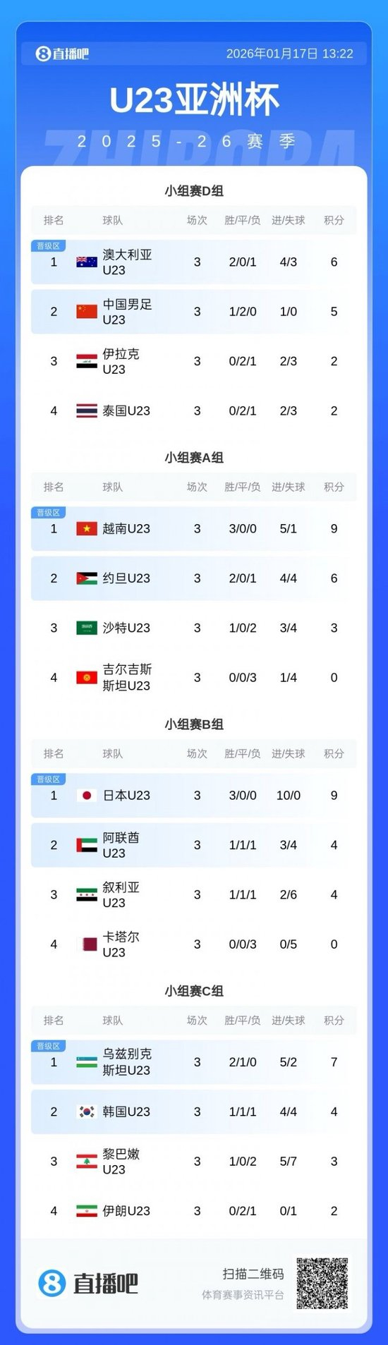 直播吧01月17日讯 今晚19:30,U23亚洲杯1/4决赛,U23国足将对阵乌兹别克斯坦U23。