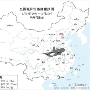 预计1月18日20时至1月19日20时,陕西南部、河南中南部、安徽北部、湖北西北部等地部分地区有大雪,其中,陕西南部、河南南部和西部、安徽西北部、湖北西北部等地部分地区有暴雪(10~15毫米)。上述部分地区新增积雪深度4~8厘米,局地可达10厘米以上。