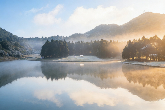 在北流市大容山,晨雾笼罩着山间湖泊,给青黛山峦与苍劲老木披上薄纱,朝阳倾洒而下,金色光束穿透薄雾,在如镜的湖面投下粼粼碎影,树影云影静静沉在水中,仿佛悄悄按下了静止键,只余山水相依的温柔。(北流市纪委监委供 李家辉/摄)