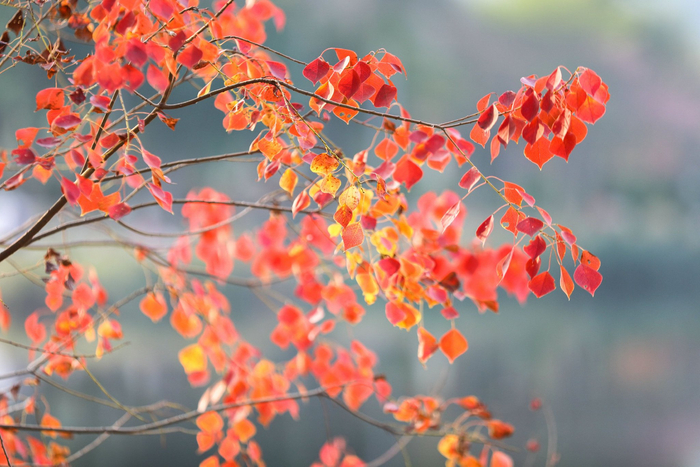 梧州市玫瑰湖公园,乌桕叶子随着气温下降也逐渐变换颜色,先由“绿装”换上“黄装”,再变“橙装”,最后换上“紫装”,长达一两个月“自然调色换装展”,给冬日的公园增添一道美丽的景色。(梧州市纪委监委供 林志清/摄)