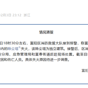 2026年2月3日18时30分左右,富阳区消防救援大队接到报警,称富通光电技术(杭州)有限公司内的除尘塔失火,该除尘塔为独立建筑。接警后,区消防救援大队第一时间联动公安分局、应急管理局和富春街道赶赴现场处置。截至目前,火势已被扑灭,现场无被困和伤亡人员。具体失火原因待进一步调查。