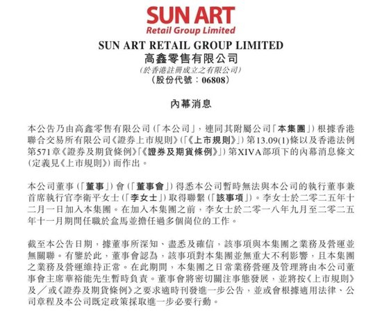 2月4日,大润发母公司高鑫零售在港交所发布公告称,公司暂时无法与执行董事兼首席执行官李卫平取得联系。
