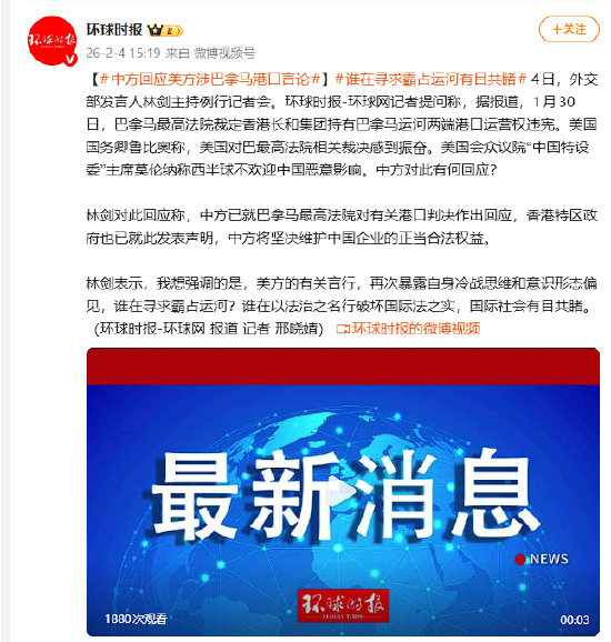 4日,外交部发言人林剑主持例行记者会。环球时报-环球网记者提问称,据报道,1月30日,巴拿马最高法院裁定香港长和集团持有巴拿马运河两端港口运营权违宪。美国国务卿鲁比奥称,美国对巴最高法院相关裁决感到振奋。美国会众议院“中国特设委”主席莫伦纳称西半球不欢迎中国恶意影响。中方对此有何回应?