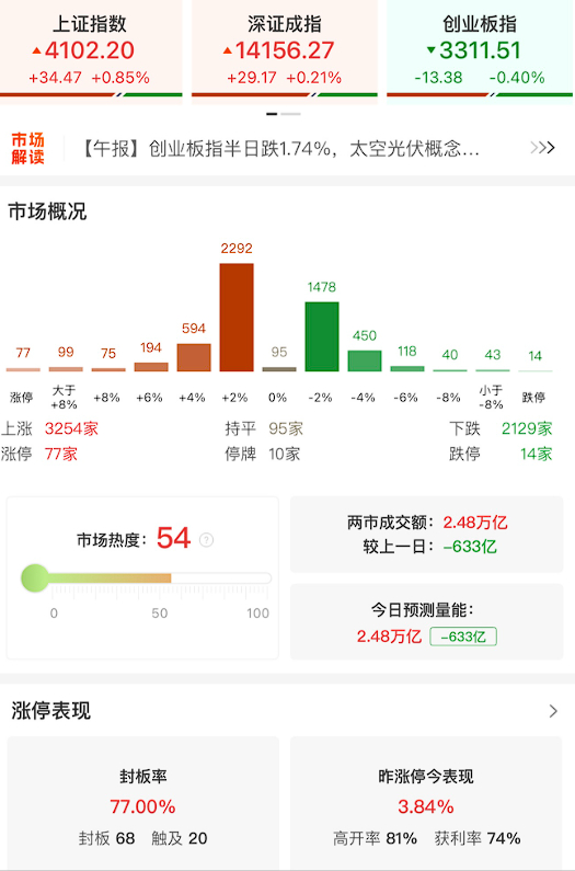 财联社2月4日电,市场探底回升,沪指重返4100点,深成指翻红,此前一度跌超1%,创业板指午后跌幅收窄。沪深两市成交额2.48万亿,较上一个交易日缩量633亿。盘面上,市场热点快速轮动,全市场超3200只个股上涨。从板块来看,煤炭概念掀起涨停潮,十余只成分股涨停,陕西黑猫、兖矿能源、中煤能源涨停。太空光伏概念爆发,中来股份20cm涨停,国晟科技2连板。机场航运概念走强,中国东航、华夏航空涨停。房地产板块表现活跃,荣安地产、财信发展、我爱我家涨停。氢能源概念快速拉升,京城股份、致远新能涨停。下跌方面,AI应用、贵金属、算力硬件等板块跌幅居前。其中AI应用概念集体下挫,引力传媒、天地在线跌停,值得买、世纪恒通等多股大跌。截至收盘,沪指涨0.85%,深成指涨0.21%,创业板指跌0.4%。
