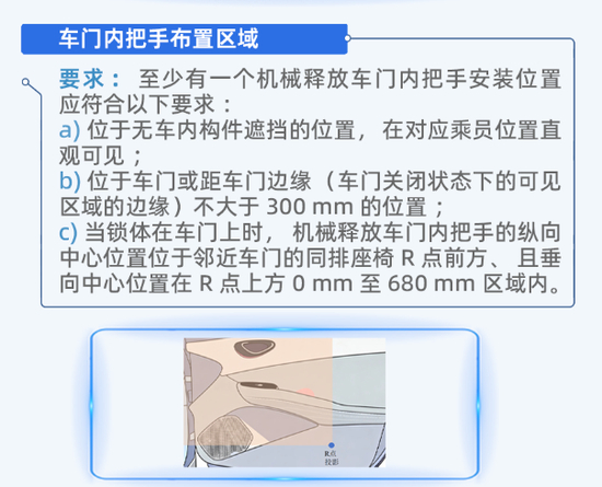 对于“车门内把手安全要求”,鉴于车门内把手操作便利性差,部分场景下功能丧失,新国标提出了机械释放配置布置区域的要求。机械释放车门内把手要求每个车门(不包括背门)应配备至少一个机械释放车门内把手,且独立操作,任一车门内把手应能够开启对应车门。车门内把手布置区域要求至少有一个机械释放车门内把手安装位置,应符合以下要求:a、位于无车内构件遮挡的位置,在对应成员位置直观可见,b、位于车门或距车门边缘(车门关闭状态下的可见区域的边缘)不大于300mm的位置。c、当锁体在车门上时,机械释放车门内把手的纵向中心位置,位于邻近车门的同排座椅R点前方,且垂向中心位置在R点上方0mm至680mm区域。