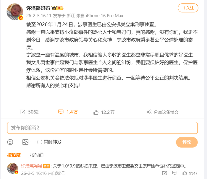 宁波发布“患儿术后离世”调查结果后,@许洛熙妈妈 于2月5日发文透露,截至2026年1月24日,涉事医生已由公安机关立案刑事侦查。