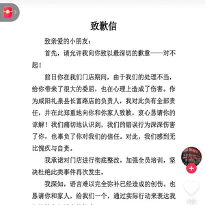 2月5日,针对“误把初中女孩当小偷扣留20分钟”一事,好想来涉事门店发布致歉信: