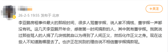 此前,嫣然天使儿童医院因拖欠租金面临关停,李亚鹏在2026年2月4日的年会发言中哽咽透露:在各方的关怀和支持下,嫣然应该可以度过这个难关,在事件发酵初期(1月20日前)便已完成大额捐款,管虎、梁静、那英、与辉同行董宇辉等人均为首批响应者。