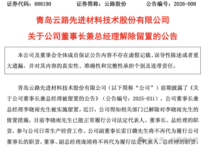 2月8日,云路股份(688190)公告,近日,公司得知相关部门已解除对李晓雨的留置措施,目前李晓雨已能正常履行公司法定代表人、董事长、总经理的职责,参与公司日常生产经营工作。