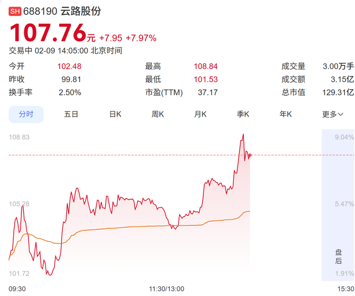 从股价情况来看,李晓雨被留置消息发布后,云路股份股价短暂下跌后曾走出一波上涨行情。2025年10月15日一度涨到了131.42元/股,截至2月9日发稿为107.76元/股,涨幅7.97%,总市值129.31亿元。