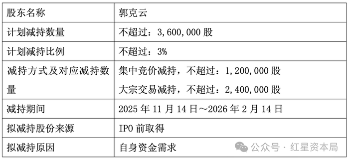 公告显示,郭克云通过集中竞价方式及大宗交易方式减持其所持有的公司股份不超过360万股,即不超过公司总股本的3%。减持期间自公告披露之日起15个交易日后的三个月内进行,减持价格按市场价格确定。