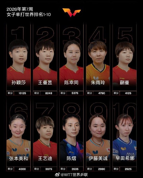 直播吧2月9日讯 国际乒联公布了2026年第7周世界排名。