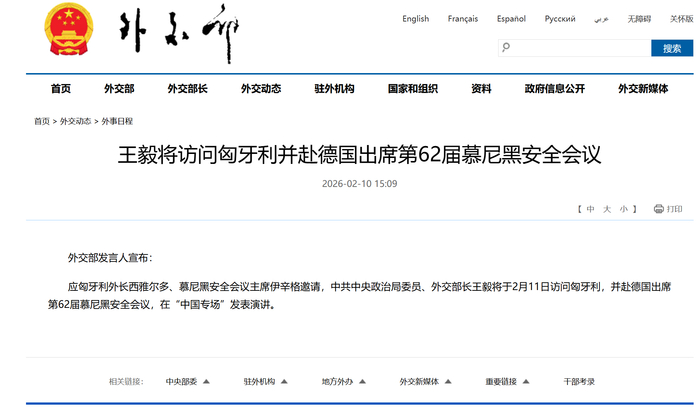 应匈牙利外长西雅尔多、慕尼黑安全会议主席伊辛格邀请,中共中央政治局委员、外交部长王毅将于2月11日访问匈牙利,并赴德国出席第62届慕尼黑安全会议,在“中国专场”发表演讲。