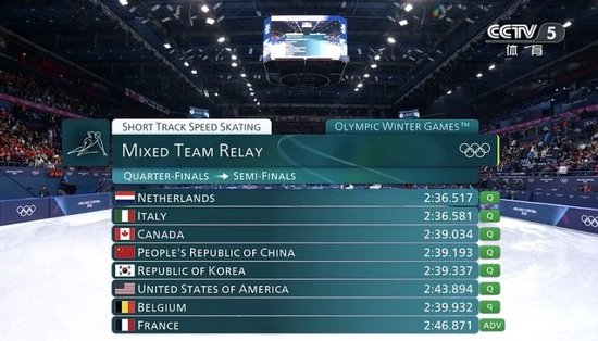 米兰冬奥会短道速滑男女混合团体接力:中国队小组第二晋级半决赛