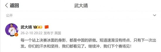 前短道速滑运动员武大靖发布社媒鼓励中国队:每一个站上决赛冰面的身影,都是中国的骄傲。短道速滑没有终点,只有下一次出发。你们的汗水和坚持,我们都看见了。继续冲,我们下个赛场见!