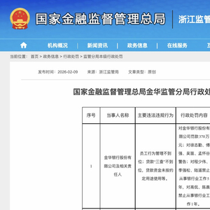 2月9日,国家金融监督管理总局金华监管分局披露行政处罚信息,金华银行股份有限公司(下称“金华银行”)及相关责任人因多项违法违规行为遭到严厉处罚,引发银行业及资本市场广泛关注。