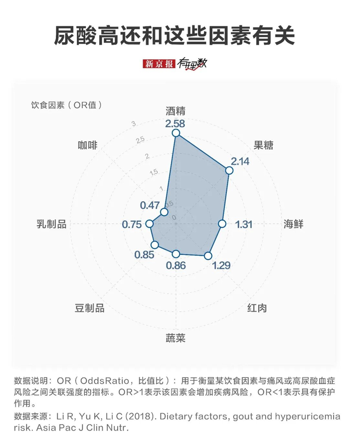 该研究指出,地域分布特征可能和饮食习惯有关,最典型的就是食物中嘌呤含量较高或干扰嘌呤代谢。