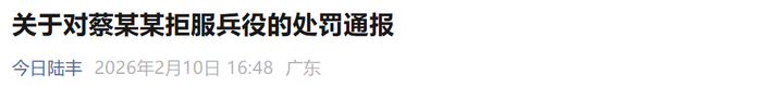 2月11日,陆丰市人民政府征兵办公室关于对蔡某某拒服兵役的处罚通报。全文如下: