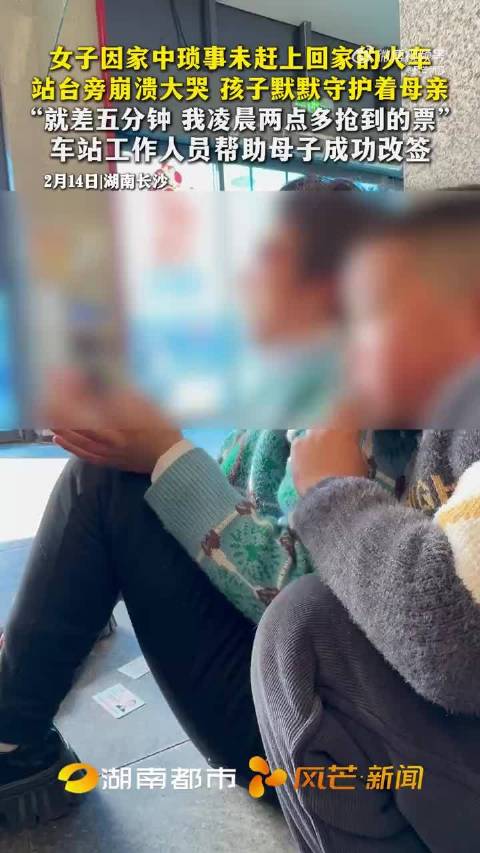 女子因家中琐事未赶上回家的火车,站台旁崩溃大哭,孩子默默守护着母亲,“就差五分钟 我凌晨两点多抢到的票”,车站工作人员帮助母子成功改签。