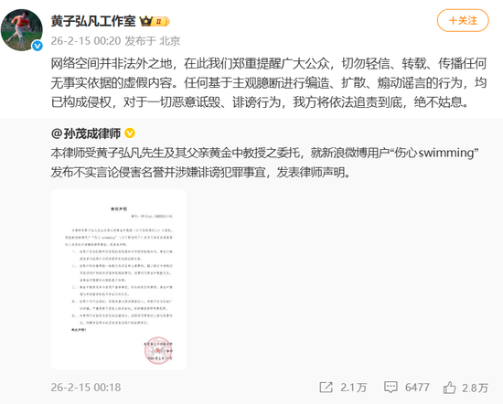 2月15日0点25分,黄子弘凡工作室转发一则律师声明并配文: