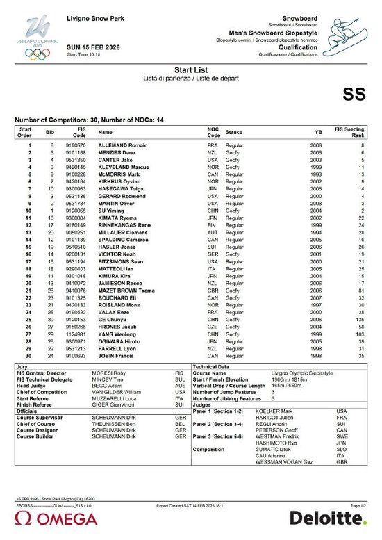 冬奥会单板滑雪男子坡面障碍技巧预赛出场名单:苏翊鸣第10位登场