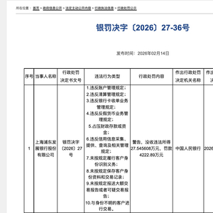 具体来看,银罚决字〔2026〕27号罚单直指浦发银行主体,该行因存在十大类违法违规行为遭严厉惩戒,具体包括违反账户管理规定、违反清算管理规定、违反银行卡收单业务管理规定、违反反假货币业务管理规定、占压财政存款或资金、违反信用信息采集、提供、查询及相关管理规定,以及未按规定履行客户身份识别义务、未按规定保存客户身份资料和交易记录、未按规定报送大额交易报告或者可疑交易报告、与身份不明的客户进行交易四项反洗钱相关违规。