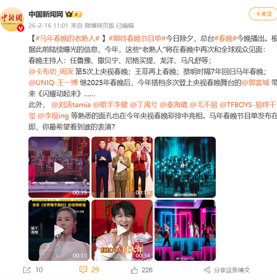 周深第5次上央视春晚,王菲将6登春晚,蔡明时隔7年回归马年春晚。
