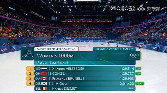 直播吧02月16日讯 米兰冬奥会短道速滑女子1000米半决赛,中国队独苗公俐1:29.737获得小组第二,闯入决赛!