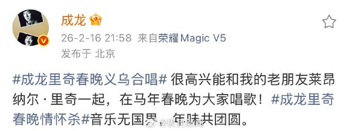 刚刚,成龙发文谈此次演出:很高兴能和我的老朋友莱昂纳尔·里奇一起,在马年春晚为大家唱歌!