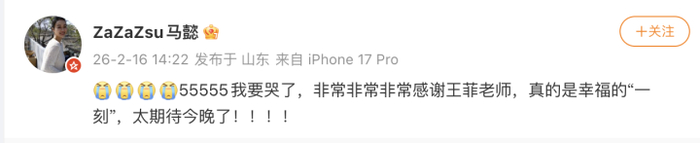16日下午,乐队主唱马懿更是在个人微博上留言说自己要哭了,“非常非常非常感谢王菲老师,真的是幸福的‘一刻’,太期待今晚了!!!!”