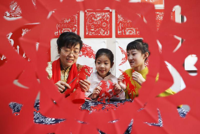 春节临近,唐山市丰润区太平路街道办事处开展“剪纸迎新春”主题活动,感受传统年俗文化,传承非遗技艺,共迎新春佳节。图为2026年2月10日,在丰润区太平路街道冀新社区,剪纸艺人葛英(左一)在教小朋友创作生肖马剪纸作品。(唐山市丰润区纪委监委供 朱大勇 摄)