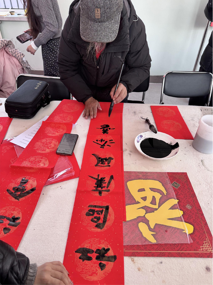 2026年1月29日,在唐山市丰润区燕山路街道建华二社区举办“挥毫泼墨书廉洁 迎春纳福树新风”主题活动,书法家正在书写春联。(唐山市丰润区纪委监委供 朱大勇 摄)