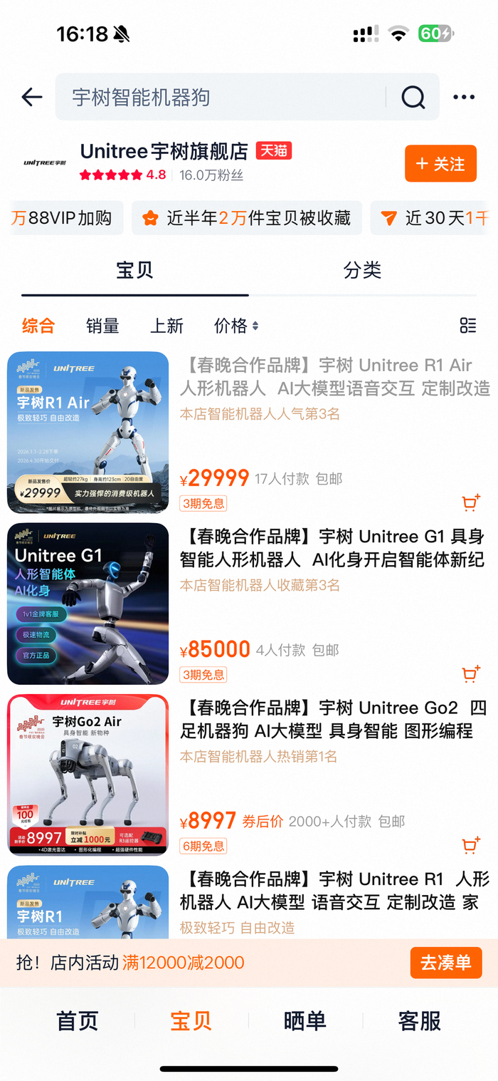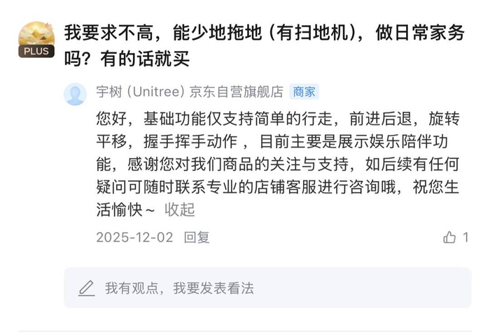 记者注意到在宇树科技官方店铺里,售价2.9万元的R1已售超百单,而售价8.5万元的G1机器人24小时内热度飙升4人付款,而销售人员对记者表示,此款并非春晚表演款,“型号功能的话没有一样的,然后推荐您购买G1 EDU 功能需要看您二次开发的情况。”销售人员表示,二次开发是已有机器人产品的基础上,通过编写新的应用程序、添加额外的传感器和设备等方式,对机器人进行个性化的功能扩展,以满足特定用户需求或实现特定功能。 如果不进行二次开发,此款机器人基础功能仅支持简单的行走,前进后退,旋转平移,握手挥手动作,目前主要是展示娱乐陪伴功能。