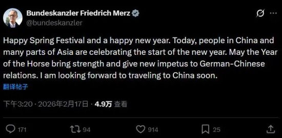 据中国新闻网消息,当地时间17日,德国总理默茨在社交媒体上发帖:“祝大家春节快乐,新年快乐!今天,中国和亚洲许多地区的人们都在庆祝新年的到来。愿马年为德中关系带来力量和新的动力。我期待着不久的将来访问中国。”