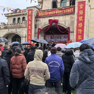 19日,活动现场铺设红地毯,设置“爱情门”,循环播放《甜蜜蜜》《最浪漫的事》等背景音乐,台下坐着贴着号码牌的男女嘉宾,众多村民冒着雨前来围观。一对结婚50年的金婚夫妇和一对结婚25年的银婚夫妇分享他们的爱情故事,主持人打趣问道:“当年谁追的谁?”“吵架了怎么办?”