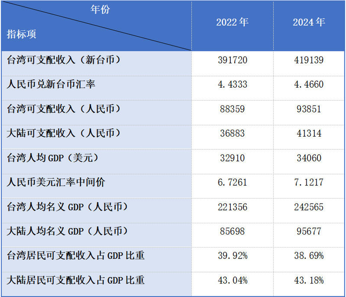 如果对比同一时期两地的人均名义GDP,就能发现一个十分重要的现象(表1):2024年,台湾居民可支配收入占GDP的比重只有38.69%,相比2022年还下降了1.2个百分点,而大陆居民人均可支配收入占GDP的比重达到43.18%,相比2022年有所上升。这说明,在提升居民收入在国民收入分配中的比重这方面,大陆优于台湾。台湾居民从GDP中得到的实际收益低于大陆居民。