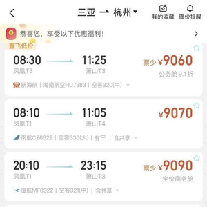 2月19日,潮新闻记者查询第三方购票平台看到,2月23日(初七,春节假期最后一天),三亚直飞杭州经济舱机票已基本售罄,当天最便宜的机票价格为9060元(不含税),售票页面显示公务舱9.1折折扣。其余几趟直飞航班只剩全价公务舱机票,票价近万元(不含税)。
