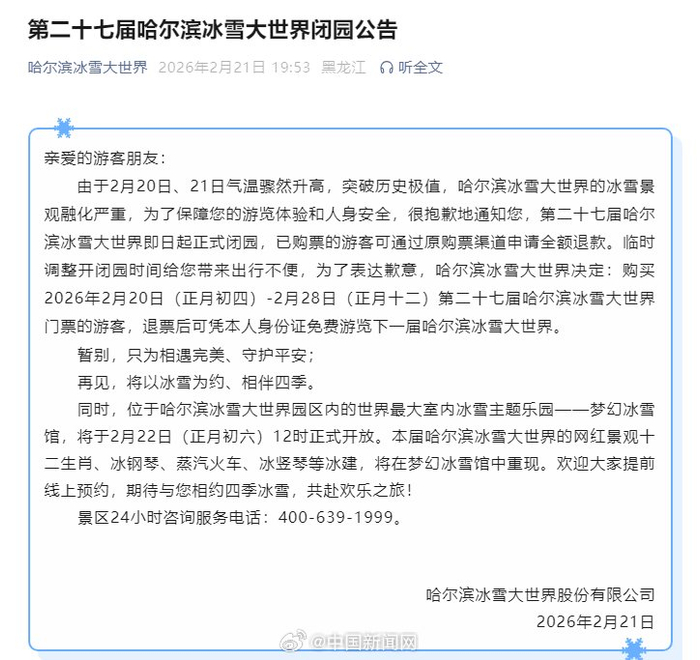 由于2月20日、21日气温骤然升高,突破历史极值,哈尔滨冰雪大世界的冰雪景观融化严重,为了保障您的游览体验和人身安全,很抱歉地通知您,第二十七届哈尔滨冰雪大世界即日起正式闭园,已购票的游客可通过原购票渠道申请全额退款。(冰雪大世界)