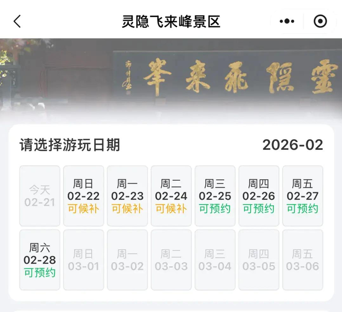 另外,杭州灵隐飞来峰景区在实施“双免”政策后迎来首个新春长假。景区预约小程序显示,2月22日至24日门票预约已进入候补状态,2月25日至28日仍可预约。