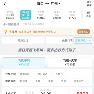 例如,2月23日假期最后一天,海口飞广州的直飞航线已售罄,购票平台推荐的中转航线售价在5700元到9900元不等;三亚飞上海、北京的直飞航线经济舱售罄,仅剩少量公务舱全价票,最贵票价近万元。