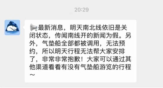 界面新闻拿到的一张截图显示,当地一家旅馆在2月21日夜里8点半还曾提醒游客,后一日(2月22日)南北线依旧是关闭状态,且气垫船也全部被调用,无法预约。“明天行程无法帮大家安排了”,该旅馆的工作人员向游客们统一致歉。