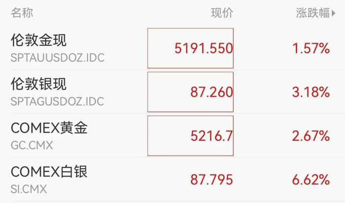 商品方面,金银拉升,现货黄金逼近5200美元关口,此前一度重回至5200美元/盎司上方。纽约期金日内涨2.67%,突破5200美元/盎司。